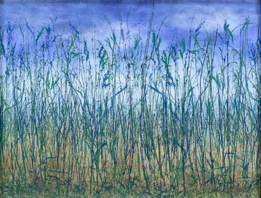Look up to find the roots of each piece. My work always work begins with the sky –the canopy that determines the underlying timbre. A melding of materials and techniques blends the sky into the horizon and earth. Then, scores of layered grass or leaf images are created using century’s old botanical printmaking. These techniques form an intricate landscape – a braid inspired by nature and made with natural materials, and with a kinetic vivacity found only in nature.